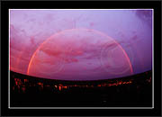 Red rainbow is born, when the sun is in the horizon and is about to descend. Red light hits the rain in the opposite horizon creating reb bow. Picture psk1534 shows the sun while in the opposite horizon the red bow 1532 could be seen.