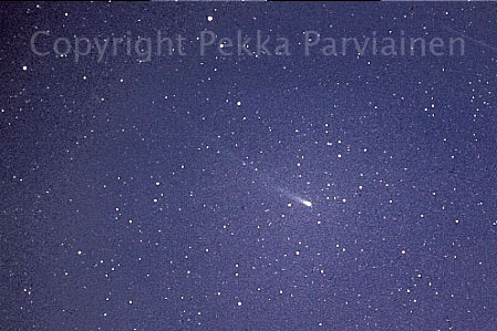 Hyakutake was at its best in late March 1996: in the night 23/24 the tail was visually 30 degrees long and in the night 26/27 40-45 degrees long. The sight was most impressive! Note the two hour startrail picture of Hyakutake (ko01123). This comet was moving so fast that its trail is not in line with stars. When I first saw these trail pictures I was puzzled: films stay in cameras over winter and this speciality was forgotten by the time film was developed. (You understand: filling a 36 frame film with exposures of 2-9 hours each isn't done in one night; actually films are loaded in autumn and removed early in summer.) Hyakutake's movement was so fast that it was possible to take stereo pictures of it; pictures only an hour apart did show weak 3D while the tail hadn't changed too much. Compare Hyakutake's trail with that of Hale-Bopp's.