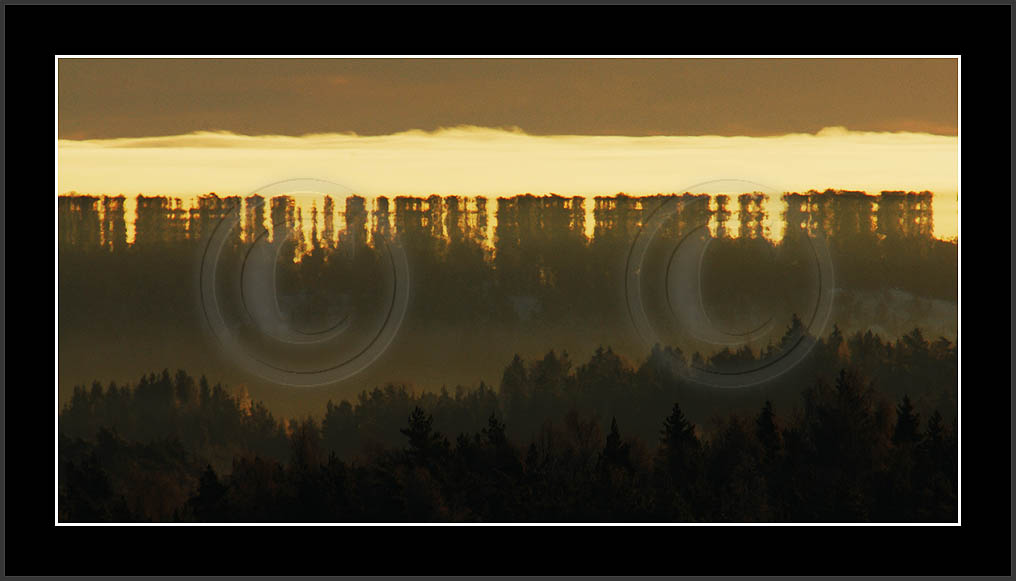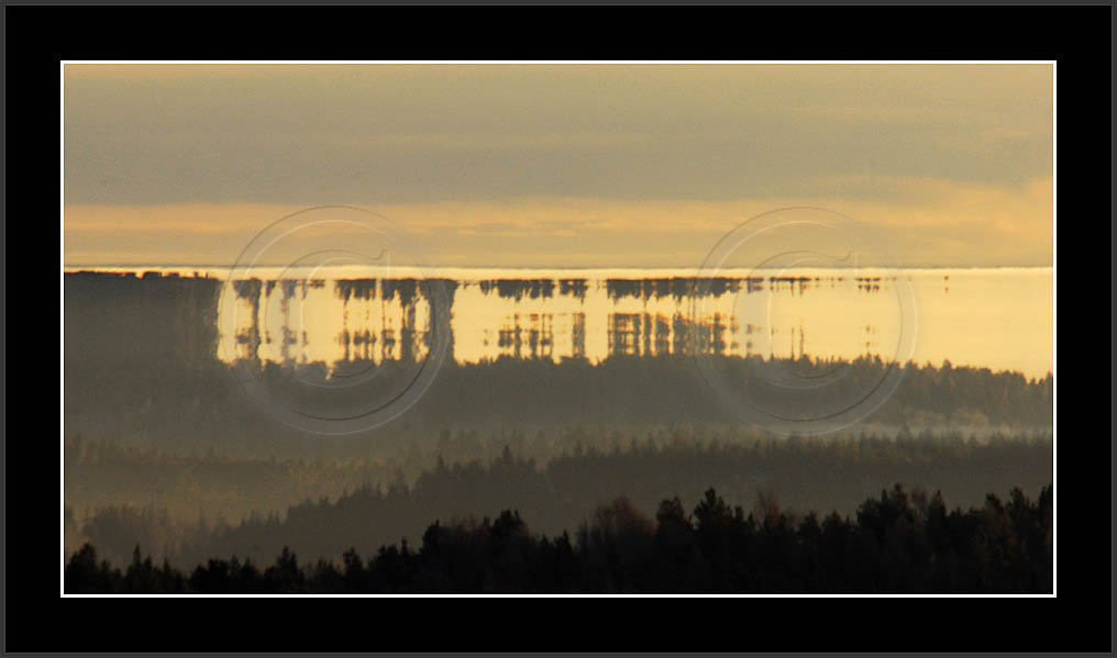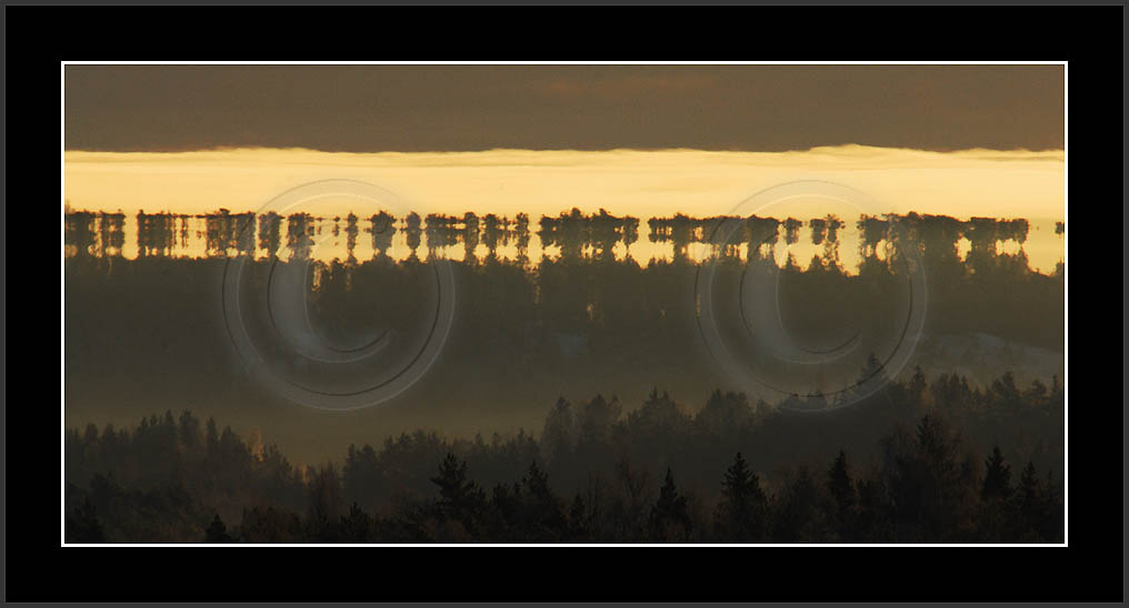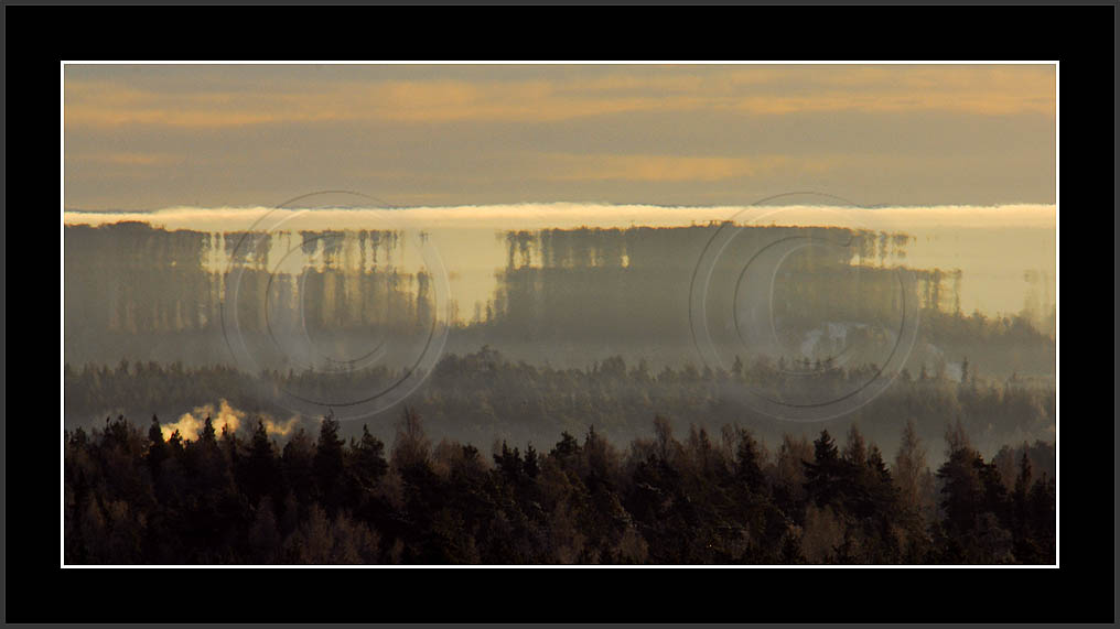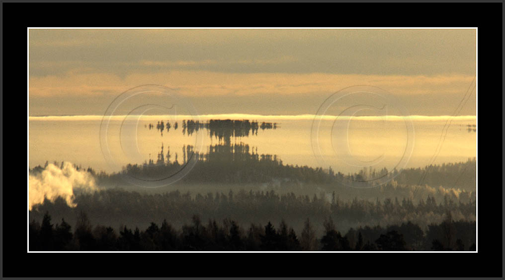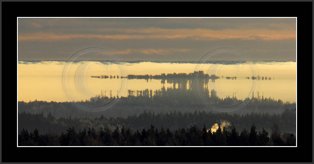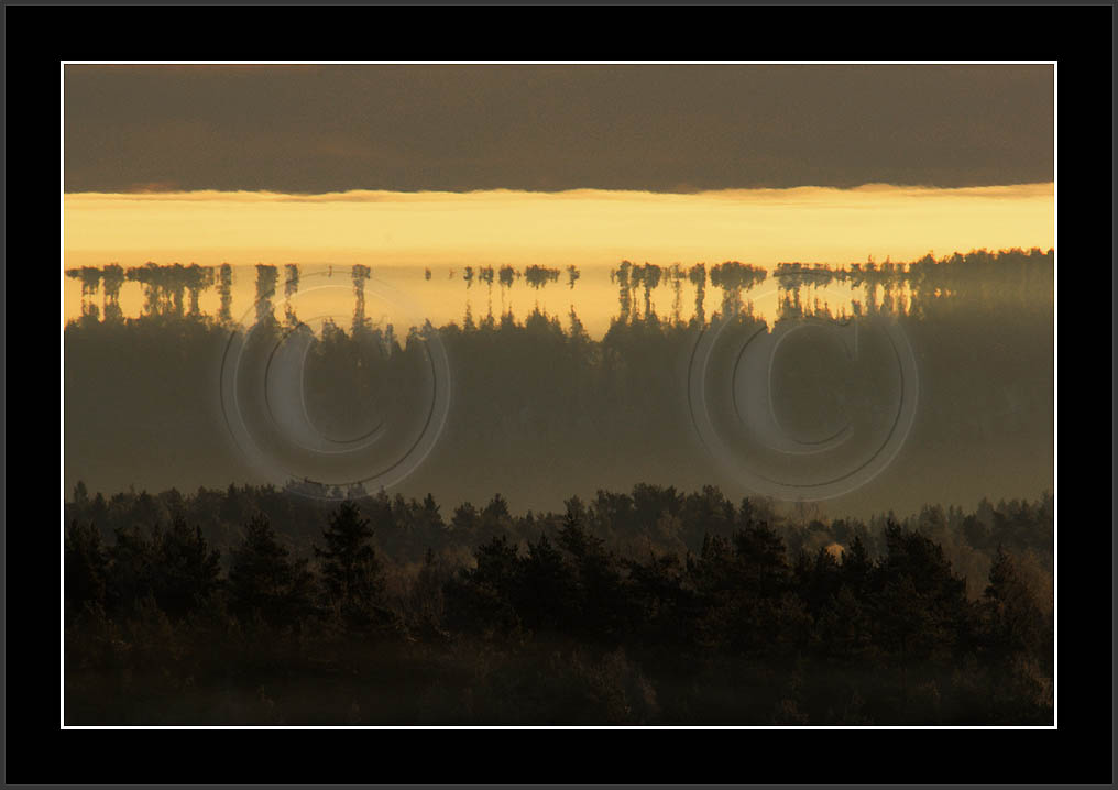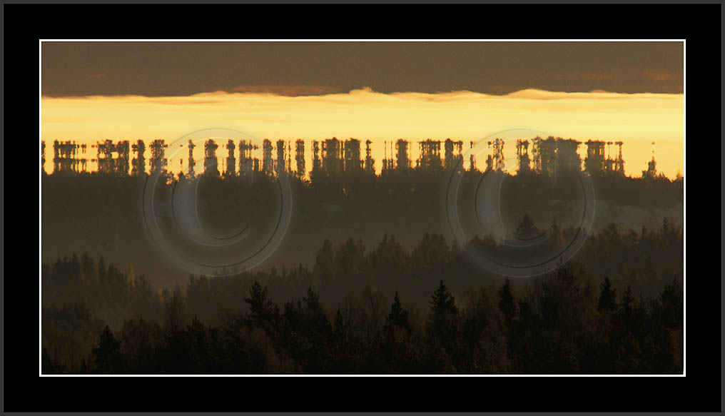 Open sea and large lakes are 'famous' of their (superior) mirages. Perhaps these phenomena are more frequent over water and perhaps stories of ghost ships and of Fata Morgana are familair and too thrilling leaving less interest in land observations. However, cold and calm winter mornings can create nice displays of distant tree lines as shown on this and on the previous page.